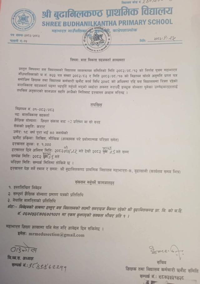 बाल विकास सहजकर्ता आवश्यकता सम्बन्धी सूचना।