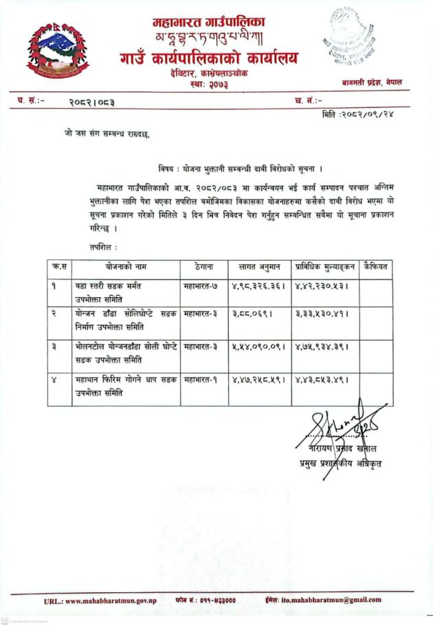 योजना भुक्तानी सम्बन्धी दाबी विरोधको सूचना।