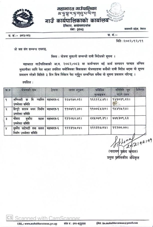 योजना भुक्तानी सम्बन्धी दाबी विरोधको सूचना।