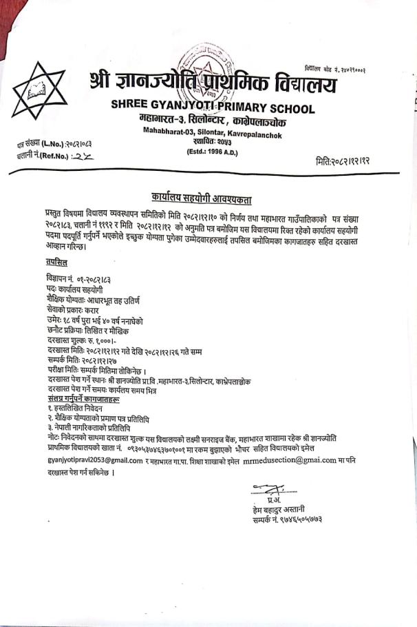 कार्यलय सहयोगि आवश्यकता सम्बन्धि सूचना।