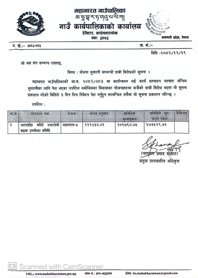 योजना भुक्तानी सम्बन्धी दाबी विरोधको सूचना।